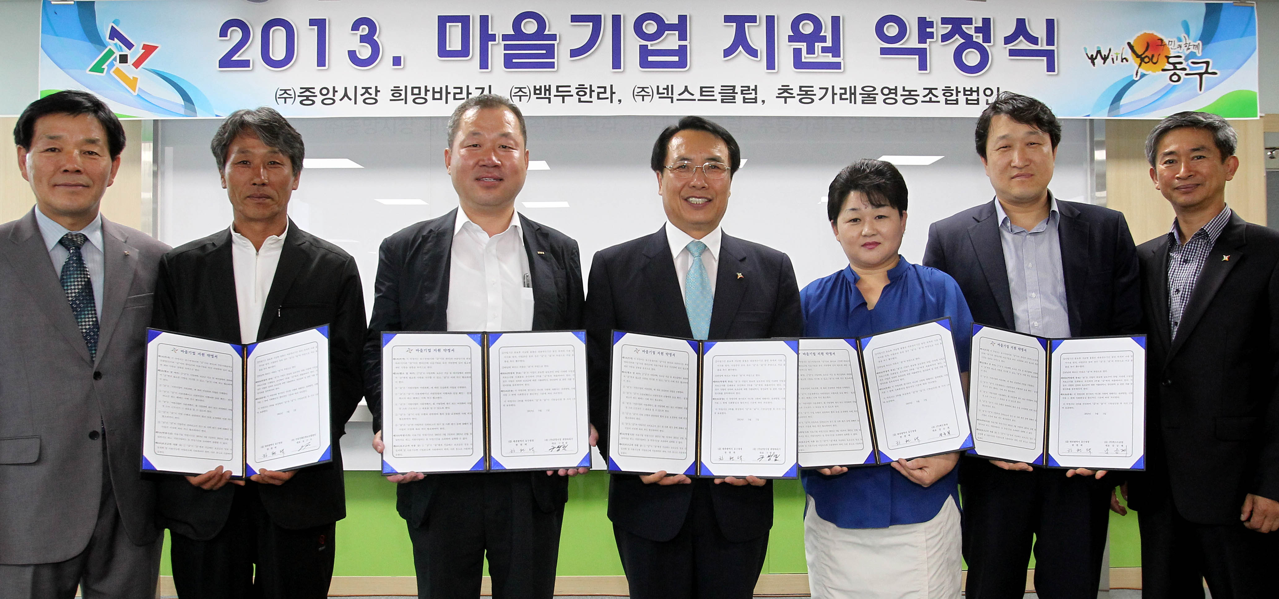 대전 동구(구청장 한현택)는 27일 구청 소회의실에서 안전행정부의 최종심사 과정을 거쳐 2013년도 마을기업으로 공식 지정된 4개 기업과 약정식을 가졌다.