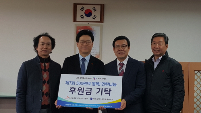 SK텔레콤 중부Infra본부가 형편이 어려운 학생을 위해 써달라며 대전동부교육지원청에 겨울철 연탄구입비 온누리상품권  4백만원을 기탁했다.
