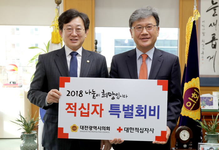 대전시의회 김경훈의장은 14일 오후 의장실에서 대한적십자사 대전세종지사(회장 정상철)에 적십자 특별회비를 전달했다.