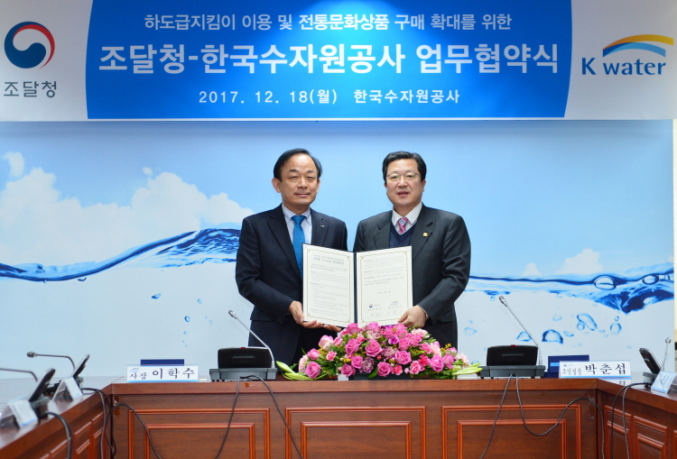 한국수자원공사(K-water)는 18일 본사에서 조달청과 ‘하도급지킴이 이용 및 전통문화상품 판로지원에 관한 업무협약(MOU)’을 체결했다.