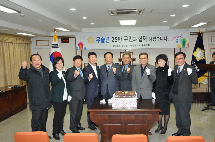 대전시 중구의회는  2일 구의회에서  무술년(戊戌年) 새해 시무식을 개최하고 25만 구민의 삶의 질 향상과 지역발전을 위한 다짐의 시간을 가졌다고 밝혔다