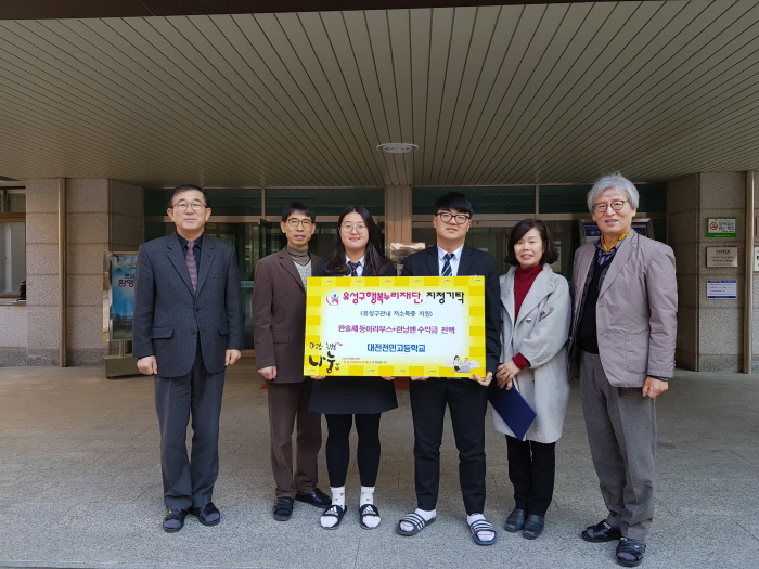 대전전민고(교장 김현태)는 4일  학교 축제기간 중 동아리 부스 운영 수익금, 스포츠클럽 ‘기부천사 런닝맨’ 후원금, 자율동아리 ‘소나기’ 김장 나눔 수익금 등 총1,684,520원을 모아 유성구 행복누리재단에 기탁했다