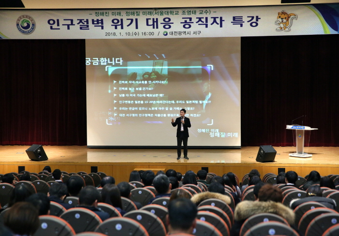 대전 서구는 10일 구청 대강당에서 공직자 400여 명을 대상으로 인구학자 조영태 서울대학교 교수를 초청해 ‘정해진 미래, 정해질 미래’라는 주제로 특강을 열었다.