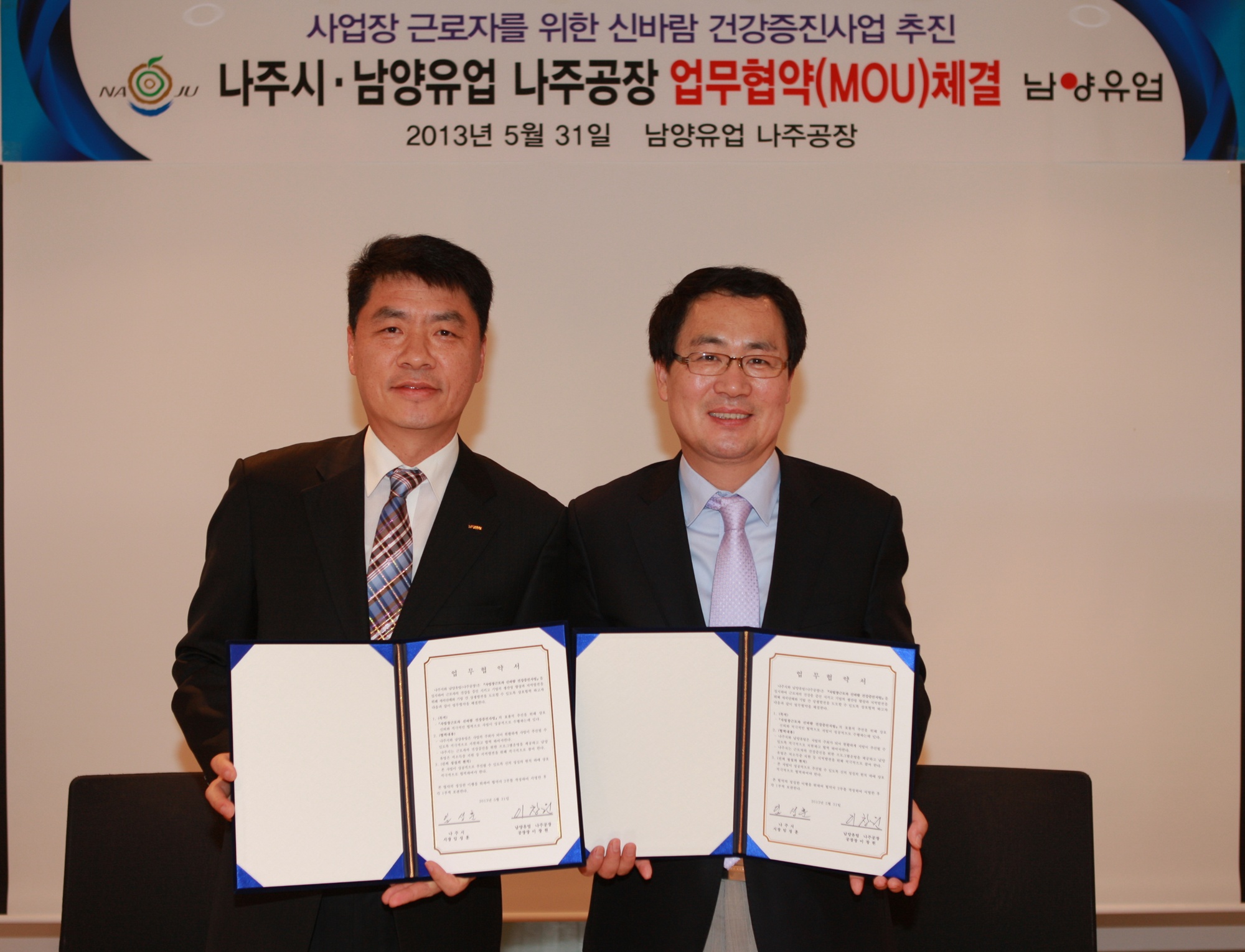 나주시와 남양유업 나주공장은 5월 31일 근로자의 건강을 증진시켜 기업의 생산성을 향상시키고, 상생발전을 위한 기반을 구축하고자 남양유업 대회의실에서 업무 협약식을 갖고 상호 협력을 다짐했다.