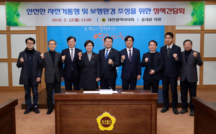 대전시의회 송대윤 의원은 12일 시의회 회의실에서 조승래 국회의원이 참석한 가운데‘안전한 자전거통행 및 보행환경 조성을 위한 정책간담회’를 개최했다.