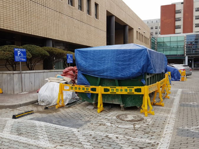 충남대병원 행정동 뒷편의 연구동 건물 앞에는 별도의 장애인 주차장이 설치돼 있다. 사회적 약자들을 위한 주차장인만큼  이용편의에 소홀함이 없아야 하지만 현실은 엉뚱하게도 배출된 건축폐기물이 버젓이 장애인 주차장 3개면을 차지하고 있다.엄연한 불법이다. 장애인주차장 이용자들의 권리를 방해하고 있는 것이다. 이로인해 장애인 차량 운전자들은 주차할 장소를 찾아 나서는 불편을 겪고 있다.