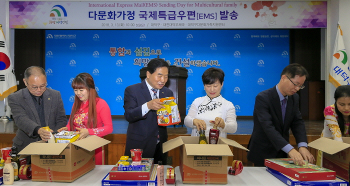 대전 대덕구는 13일 구청 청렴관에서 다문화가정 50세대와 국제특급우편요금 지원 협약을 맺은 3개 기관(대덕구, 대전대덕우체국, 대덕구다문화가족지원센터)과 함께 국제특급우편 발송 행사를 가졌다.