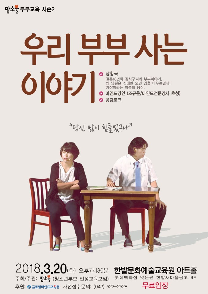 부부사이 소통을 위한 공감 토크쇼가 오는 20일 오후 7시 한밭문화예술교육원 아트홀에서 열린다.