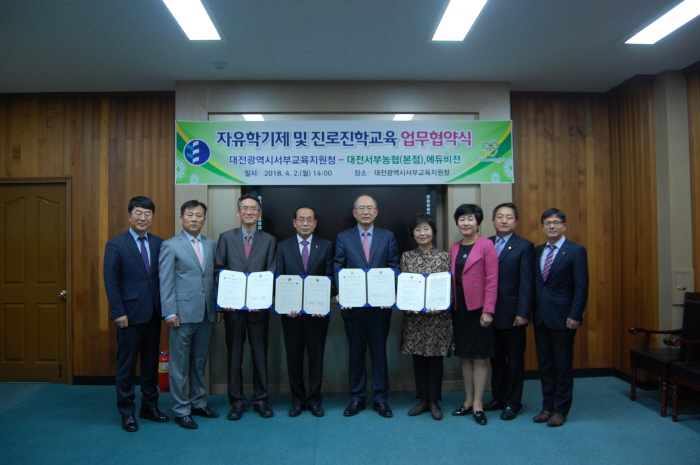 대전서부교육지원청은 2일 서부교육청 접견실에서 대전서부농협(조합장 임헌성) 및 ,에듀비젼(대표 박춘자)과 자유학기(년)제 및 진로진학교육의 공동 발전을 위한 업무협약을 체결했다.
