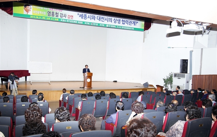 염홍철 대전시장은 21일 오후 충남 연기군 연기문화원에서 군민 및 공무원 150여명이 참여한 가운데 ‘세종시 출범과 대전시의 상생협력’이란 주제로 세종시민대학 특강을 실시했다.