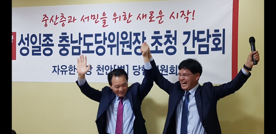성일종 충남도당위원장과 이창수 천안병 당협위원장이 간담회를 마치며 필승을 다짐하는 만세를 하고 있다.