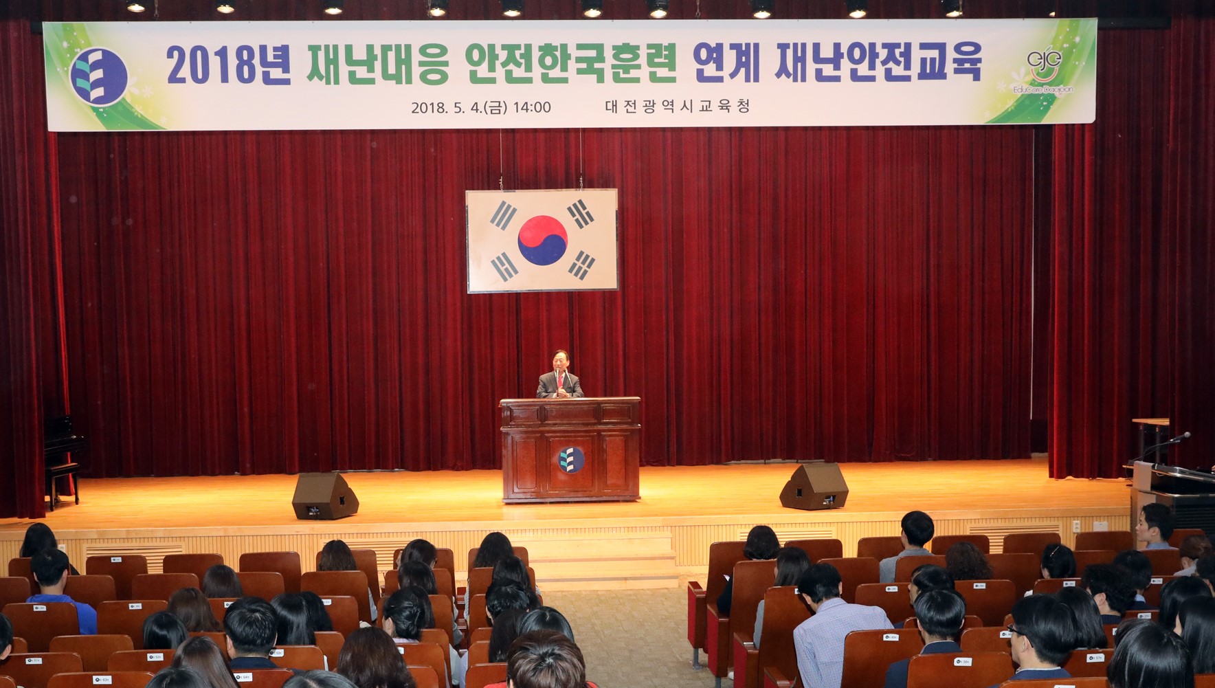 대전시교육청(교육감 설동호)은 5월 4일(금) 14:00, 시교육청 대강당에서 각급 학교 안전한국훈련 담당자, 교육(지원)청 및 직속기관 재난업무담당자를 대상으로 ‘2018 재난대응 안전한국훈련 연계 재난안전교육’을 실시했다.
