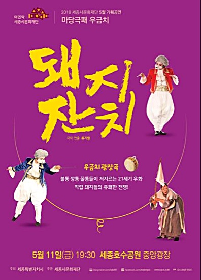한편, ‘돼지잔치’는 2013년 10월 초연 이후 현재까지 15회 무대에 올랐으며, 제1회 창작국악극 연주상 수상과 하이서울페스티벌, 고양호수예술축제 등에 초청작으로 선정되는 등 작품성을 인정받은 바 있으며, 1990년 창단하여 대전을 기반으로 전국적인 활동을 하고 있는 우금치는 마당극 전문 공연 단체로, 이번 공연은 세종-대전 상생협력 차원에서 세종시문화재단의 초청으로 성사되었다.