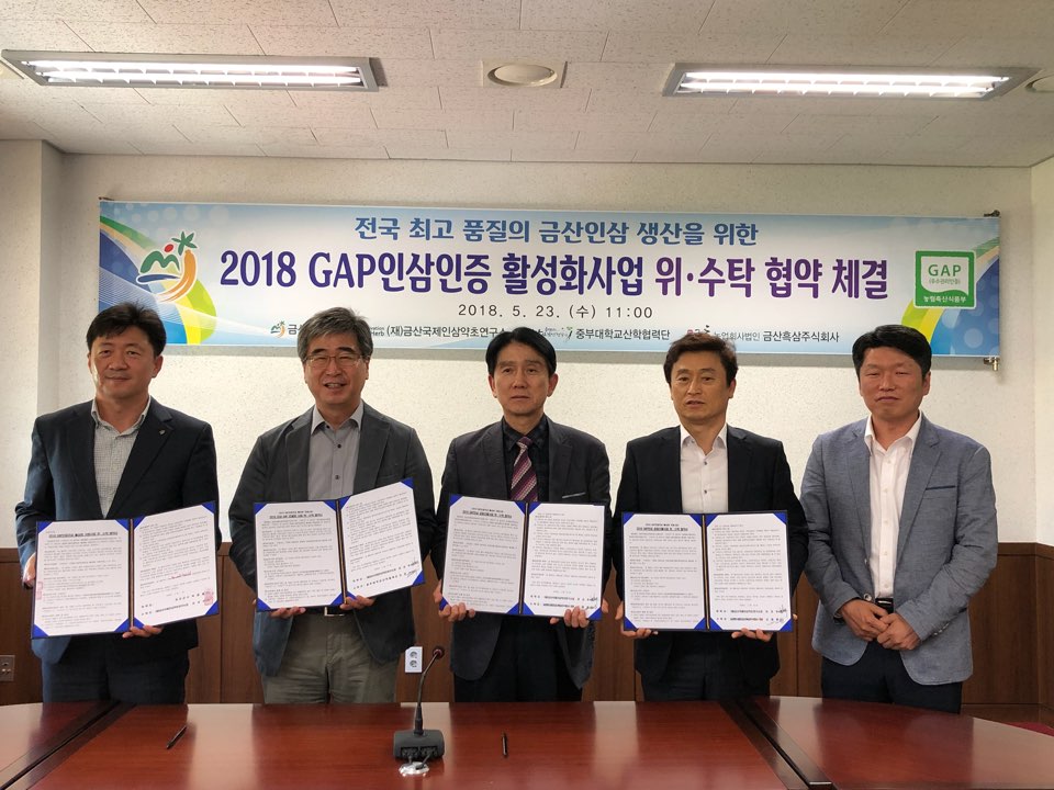 금산군은 지난23일 (재)금산국제인삼약초연구소, 중부대학교, (주)금흑과 협력 네트워크 구축을 내용으로 하는 ‘GAP인증인삼 활성화 사업 위·수탁 협약식’을 가졌다.