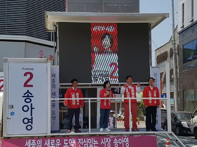 자유한국당 송아영 후보가 31일 조치원 전통시장 유세에 나섰다. 선거운동 첫째 날에 자신의 고향이자 거주지인 조치원을 가장 먼저 찾은 것이다. 송 후보는 “이춘희 후보가 조치원 지역이 4년 전보다 좋아졌다고 했는데 동의하시냐”며 “이춘희 후보가 이곳에 관심이 전혀 없다는 것을 알려주는 말”이라고 강조했다. 또한, “균형발전으로 원도심과 신도심이 공존해야 세종에 미래가 있다”고 원도심 지역 발전의 중요성을 역설했다.