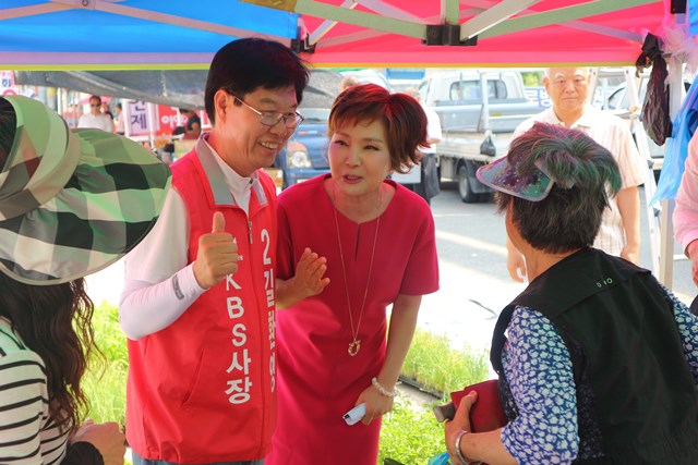 분홍색 정장차림의 인기 개그우먼 김보화씨는 길 후보와 함께 장터 곳곳을 돌며 주민들 한사람 한사람을 만나며 반갑게 인사를 나눴다.
