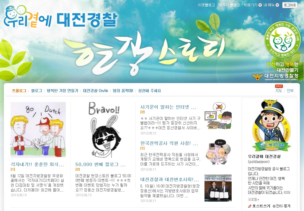 대전지방경찰청(청장 정용선)은 공식 블로그 ‘현장스토리’가 개설 후 2개월 만에 방문자 수 5만 명을 돌파하여, 이를 기념 5만 번째 방문객에게 소정의 상품을 주는 이벤트를 마련했다.