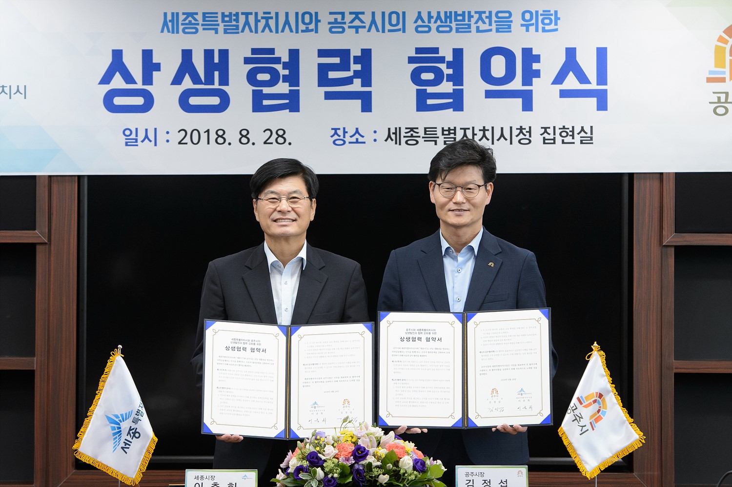 이춘희 세종특별자치시장과 김정섭 공주시장이 28일 세종시청에서 ‘상생협력 협약’을 맺고, 상생발전을 위한 4개 분야 20개 과제를 추진하기로 했다.