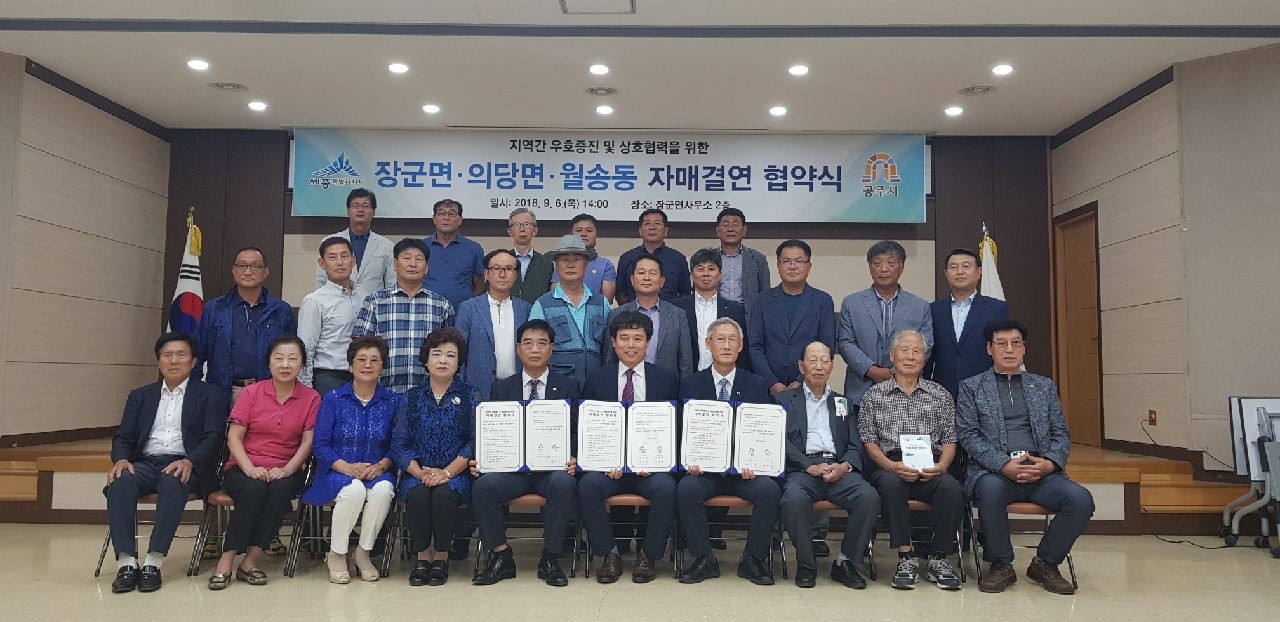 세종특별자치 장군면(면장 임윤빈)이 6일 면사무소에서 공주시 의당면, 월송동과 자매결연 협약을 체결하고, 역사·문화체육·인구증가시책 등 다양한 분야에서 상호 협력에 나선다.