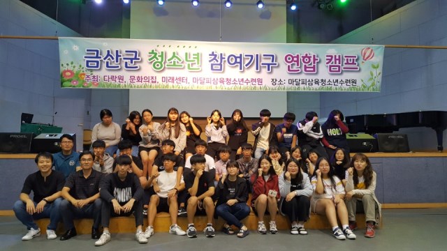 이 행사에는 금산 청소년 미래 센터 청소년운영위원회, 금산 다락원 청소년수련관 청소년운영위원회, 마달피 삼육청소년수련원 청소년운영위원회, 금산문화의집 청소년참여위원회, 금산문화의집 방과후 아카데미까지 5개 기구, 총 32명의 청소년들이 한자리에 모였다.