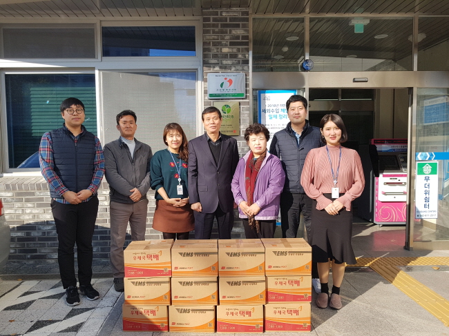 대전시설관리공단 직원들이 전민동 주민센터에 사랑의 감을 전달하고 기념사진을 촬영하고 있다.