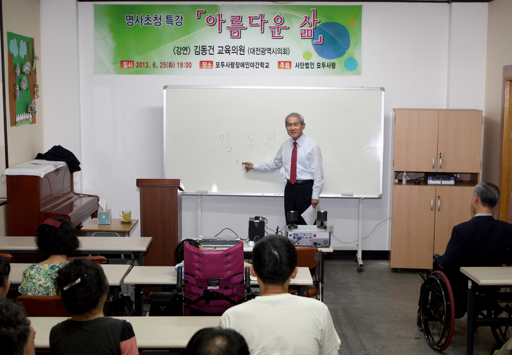 대전시의회 교육의원인 김동건 의원은 지난 25일 오후 7시 모두사랑 장애인야간학교로부터 명사초청 강사로 위촉돼 ‘아름다운 삶에 대하여’란 주제로 특강을 실시해 장애학생 등으로부터 큰 호응을 얻었다.