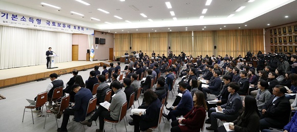 경기도는 21일 오후 도청 제1 회의실에서 이재명 경기도지사와 정대운 경기도의회 기획재정위원회 위원장, 이한주 경기연구원 원장 등 100여 명이 함께한 가운데 ‘기본소득형 국토보유세’ 토론회를 열었다. 앞서 도는 지난달 8일 국회에서 같은 주제를 놓고 토론회를 개최한 바 있다.