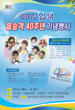 당진시 합덕읍이 읍승격 40주년을 맞아 ‘희망찬 합덕읍 융성 원년의 해’를 선포하고 오는 28일부터 29일까지 합덕읍 일원에서 합덕 읍승격 40주년 기념행사를 갖는다.