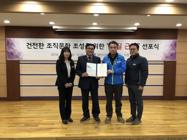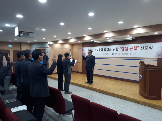 대전시설공단은 지난 29일 공단본부 홍보실에서 전 임직원이 참석한 가운데 갑질 근절 실천결의를 위한 ‘갑질 근절 선포식’을 개최하였다고