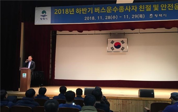 평택시(시장 정장선)는 11월 28일부터 29일까지 2일간 남부문화예술회관에서 시내버스 3개사 운수종사자 547명을 대상으로 2018년 하반기 버스운수종사자 친절 및 안전운행 교육을 실시했다.