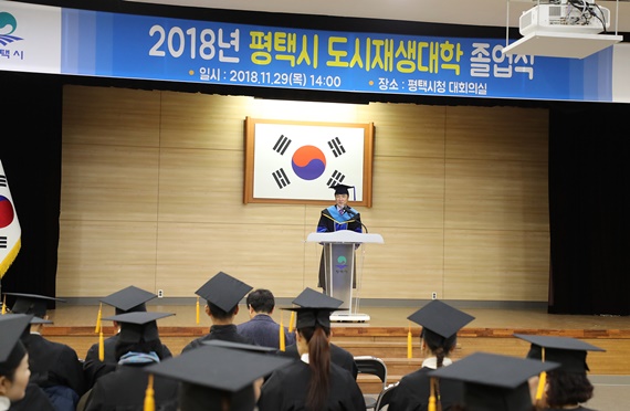 [세종TV-송상희기자] 평택시(시장 정장선)는 도시재생 주민역량 강화 및 주민리더 양성을 위한 제4기 도시재생대학 수료식을 지난 29일 시청 대회의실에서 개최했다.시가 주최하고 평택 도시재생지원센터에서 주관해 원도심의 공동화 및 쇠퇴현상의 해결방안을 모색하기 위해 교수와 전문가로 강사진을 구성한 도시재생대학은 제4기 수강생 80여명을 대상으로 10주 과정으로 진행됐다.