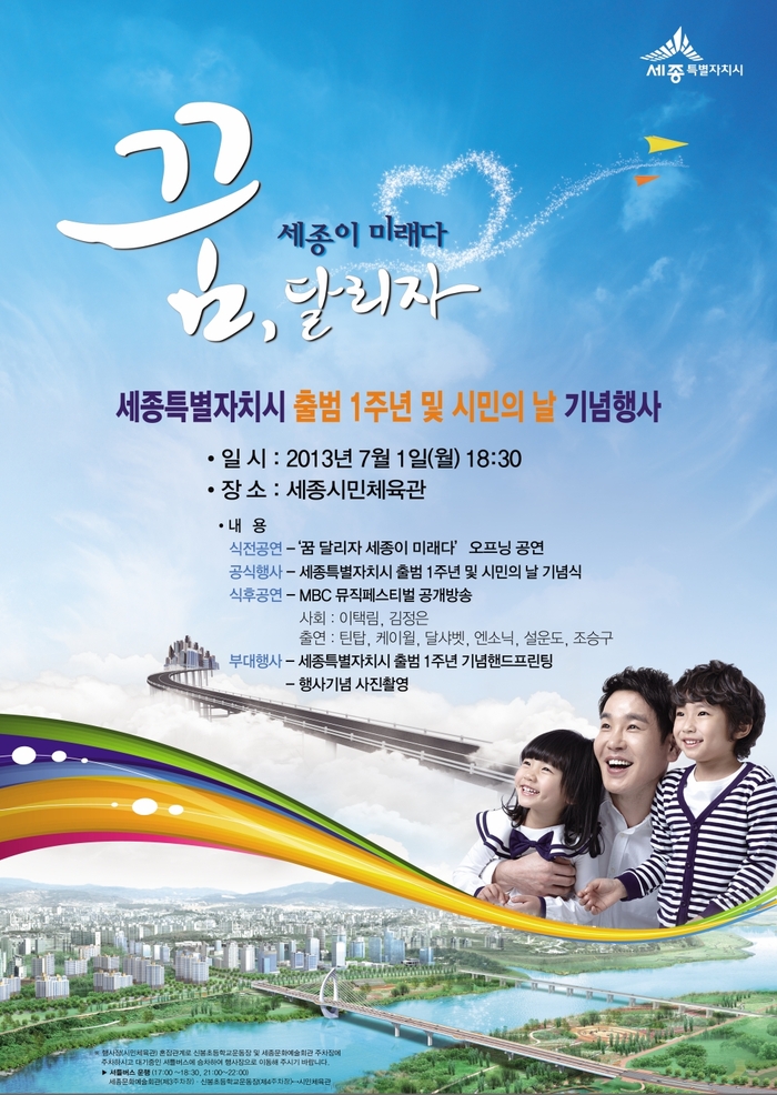 유한식 시장은 “세종시를 우리 후손들이 자랑스러워할 세계적 수준의 교육․문화․복지환경이 갖춰진 살기 좋은 도시로 조성해 나가겠다”며 “세종시민 모두가 출범 1주년과 시민의 날 행사의 주인공인 만큼 많이 참석하셔서 즐겁고 정겨운 시간을 보내기 바란다”고 말했다.