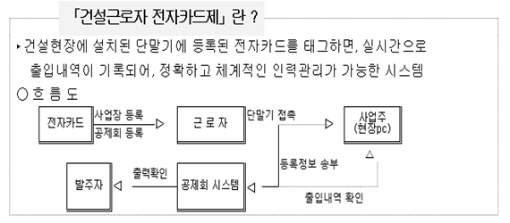 ‘전자카드제’는 건설근로자가 건설 현장에 설치된 단말기에 전자카드를 태그하면 실시간으로 출․퇴근 내역이 기록되고, 이를 바탕으로 시공자가 건설근로자의 퇴직 공제부금까지 신고할 수 있는 체계적인 인력관리 제도이다.