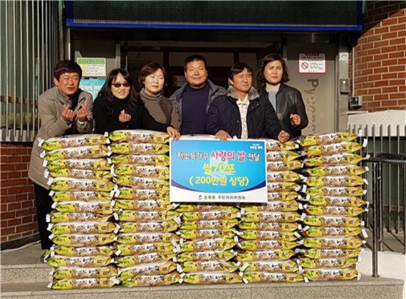 ▲ 송북동 주민자치위원회 최관문 위원장이 지난 6일 어려운 이웃에게 쌀 70포(10kg-200만 원 상당) 전달했다. 최관문 위원장은 "도움의 손길이 필요한 분에게 훈훈한 정을 나눠 드릴 수 있어 기쁘다" 했다. 최윤순 송북동장은 "지역사회를 먼저 생각하고 매년 베풀어 주신 정성에 감사드리며, 따뜻한 마음을 담아 어려운 이웃에게 전달하겠다" 했다.<사진제공 평택시청>