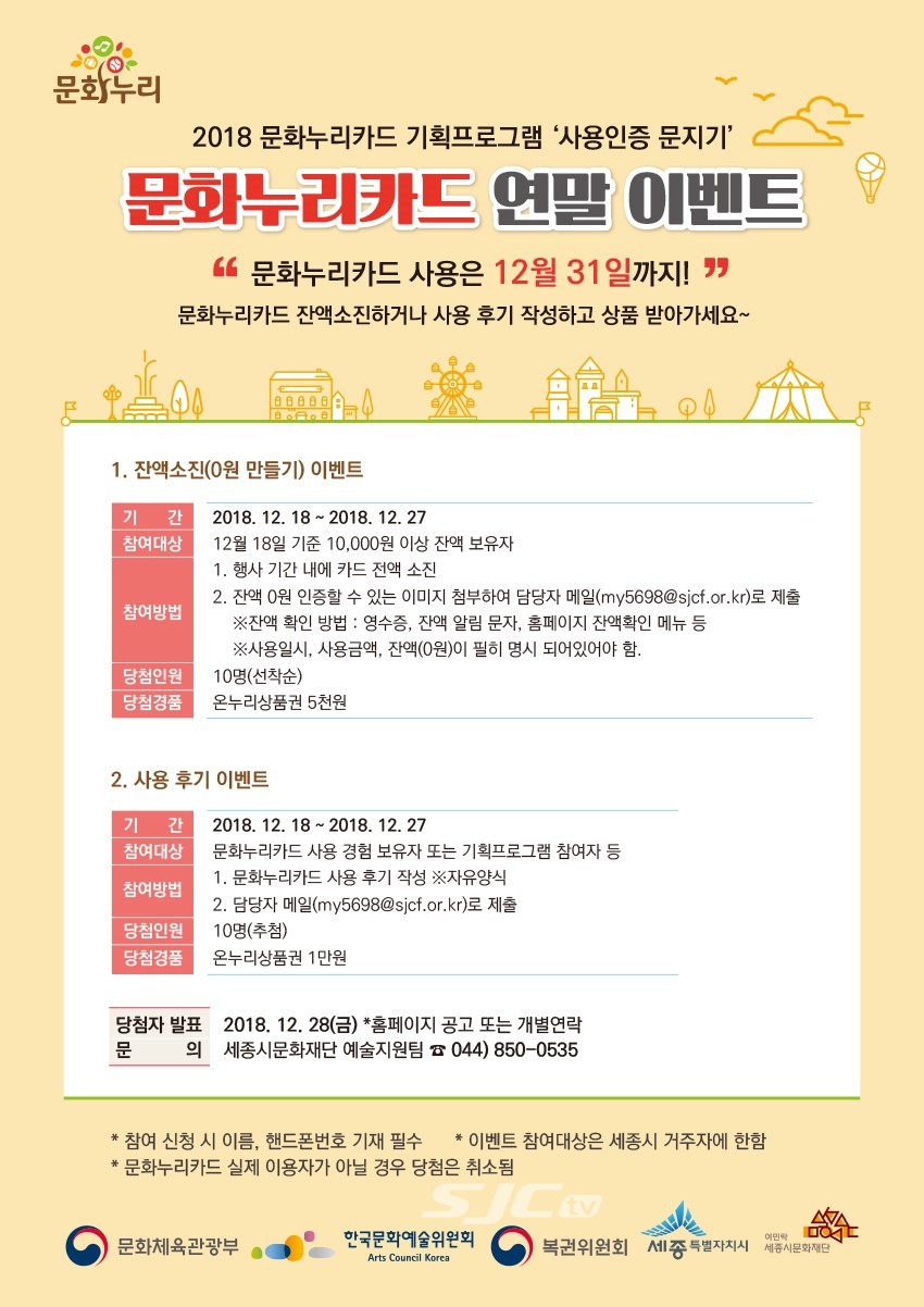 세종시문화재단(대표이사 인병택)은 18일부터 27일까지 문화누리카드 연말 이벤트를 진행한다.