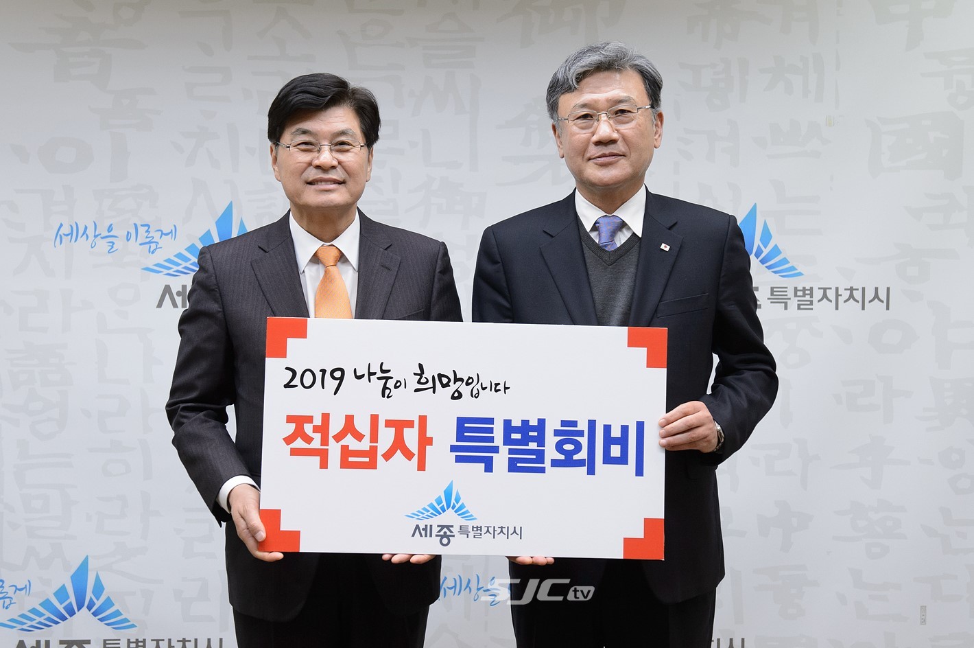 이춘희 세종특별자치시장이 20일 대한적십자사 대전·세종지사에 2019년도 적십자 특별회비 300만 원을 전달했다.