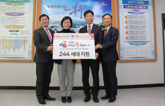 ▲ BNK금융그룹희망나눔재단은 지난 26일 사회적기업 생산품으로 구성된 ‘사랑의 복꾸러미’ 생필품 244세트(1,220만원상당)를 저소득 소외계층을 위해 북구청에 기탁했다. 이 날 전달받은 생필품세트는 관내 저소득가정 244세대에 전달될 예정이다.정명희 북구청장은 “매년 어려운 지역주민들을 위해 각종 성품을 기탁해 주셔서 감사드린다. 전달받은 성품은 어려운 지역주민들에게 잘 전달하겠다”고 전했다.