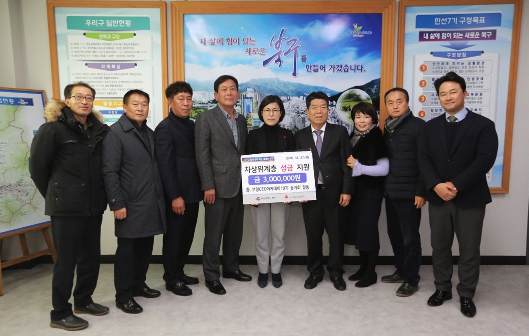 ▲ 부산 북구 정명희 북구청장에게 화명3동 대우이안아파트 주민일동(입주자대표 손재순)은 지난 21일 ‘희망2019 나눔 캠페인’ 이웃돕기 성금 2,018,000원을 맡겨 지역사회 어려운 이웃을 위해 따뜻한 나눔을 실천하였다.