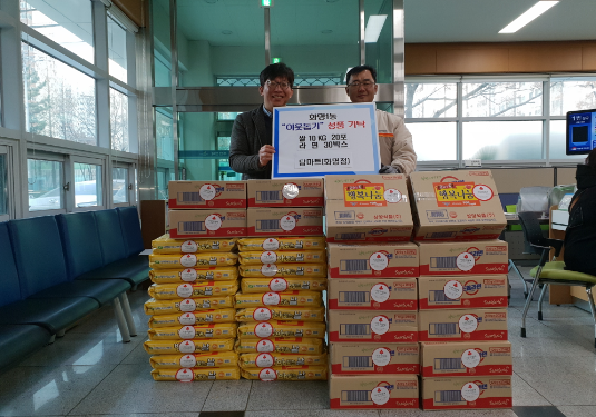 ▲ 화명1동에 위치한 탑마트(지점장 김태훈)는 지난해에 이어 올해도 연말 저소득층을 위한 성품으로 70만원 상당의 쌀(10kg, 20포)과 라면(30박스)을 화명1동 주민센터에 맡겼다. 김태훈 지점장은“작은 손길이지만 이웃에게 도움을 줄 수 있어 기쁘다. 기탁한 물품으로 추운 겨울 소외계층의 마음이 따뜻해지길 바란다”고 전했다. 이 날 전달받은 라면과 쌀은 화명1동 저소득 가정 50세대에 전달될 예정이다.