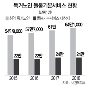 사회의 도움이 필요한 취약 홀몸노인이 해마다 늘고 있다고 한다. 정부의 기본적인 돌봄 서비스를 받는 사람은 절반도 안 되는 것으로 나타났다. 정부가 기초연금 확대 등 소득 지원 복지에만 치중하느라 홀몸노인 돌봄 문제에는 소홀한 것 아니냐는 비판이 나온다.
