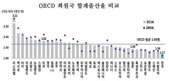 통계청이 발표한 ‘2017년 출생통계’에는 2016년 기준 OECD 회원국의 합계출산율 현황을 보면, 36개 OECD 회원국의 합계출산율 평균은 1.66명이다. 2015년 평균과 같다.