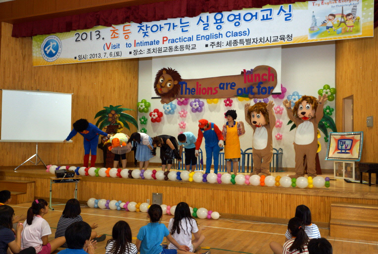 이날 조치원교동초에는 4개 학교 150여명의 학생들이 참여했고, 처음부터 끝까지 영어로 진행되는 다양한 활동의 레크레이션과 원어민들의 창작 뮤지컬 ‘The Lions Are Out for Lunch’이 흥미롭게 펼쳐졌다.