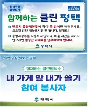 시 관계 담당 공무원은 “행정기관만의 일방적이고 획일적인 추진만으로는 청소행정 효율성은 없다. 시민이 스스로 깨끗한 환경과 관심, 의식이야 만이 가능하므로 시는 홍보와 동참을 유도할 수 있는 청소시책에 ‘함께하는 클린 평택’을 만들어 가는데 일임을 다 하겠다.”고 밝혔다.