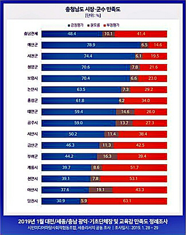 뒤이어 김석환 홍성군수(61.8%), 가세로 태안군수(59.4%) 김정섭 공주시장(59.0) 맹정호 서산시장(50.2%) 문정우 금산군수(46.3%) 박정현 부여군수(44.2%)로 평가됐다.