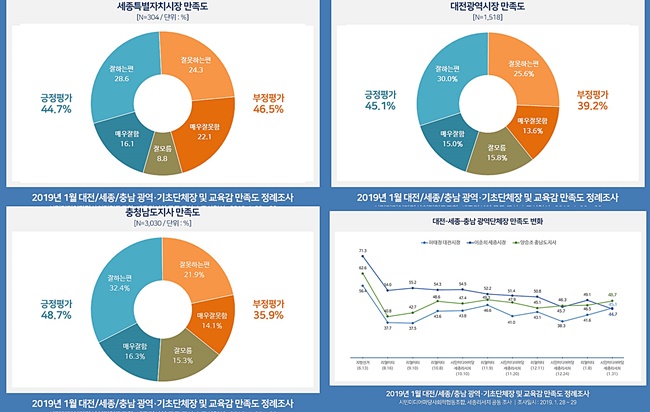 이같은 조사는 시민미디어마당 사회적협동조합과 세종리서가 지난달 28, 29일 충청권 시・도지사 및 교육감과 20개 시장・군수・구청장을 대상으로 한 직무수행 만족도 정례조사결과 이같이 나타났다.
