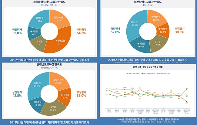 설동호 대전시교육감 역시 긍정 직무수행 만족도 결과 전월 대비 12.5% 상승해 만족도 52.0% 큰 폭으로 올랐으며, 김지철 충남교육감의 경우 전월 대비 1.9% 올라 42.8% 긍정평가 됐다.