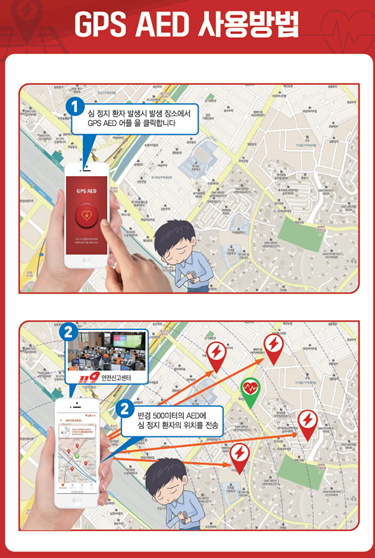작동원리는 심정지 환자 발생 시 주변 사람이 스마트폰 앱을 실행하여 버튼을 누르면 근처 119센터 또는 반경 500m 내에 설치된 AED로 심정지 환자의 위치가 자동 전송되는 동시 경보음과 함께 AED 전자 지도에 환자의 위치 및 경로가 표출되는 기술이다.
