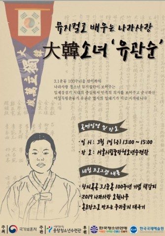 한국청소년연맹(한기호 총재)이 서울특별시(박원순 시장)로부터 위탁 받아 운영하는 ‘서울시립중랑청소년수련관’은 청소년들의 올바른 역사의식 함양과 3.1운동 100주년 기념을 위한 뮤지컬 ‘大韓소녀 유관순’을 공연한다고 26일 밝혔다.