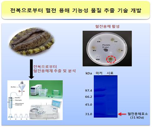 특히 전복연구센터 연구팀이 전복 내장에서 추출한 신물질은 혈전 용해 활성(클리어존 길이)이 85.0mm로 현재 시장에 유통되는 혈액순환개선물질 A제품(31.7mm)보다 2.7배나 높은 것으로 확인됐다.