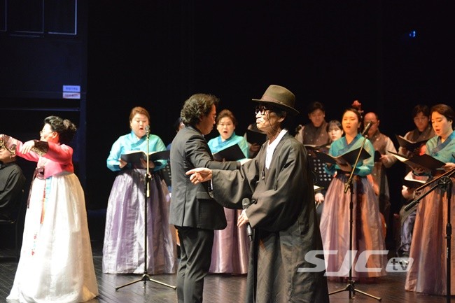 공주시립합창단과 어바웃클래식, 소리꾼 이걸재씨가 합동 공연한 '긴 아리랑' 이 환상의 하모니를 선보이며 공주 문예회관 공연장 안을 감동의 물결로 가득 매웠다.
